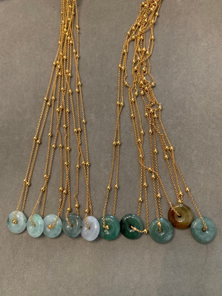 Jadeite Donut Pendant represents Ping An Kou, a timeless Chinese Jade design meaning “safe and trouble-free”. A coin shaped Jadeite pendant (colors vary) on an 18” 24k Gold Filled necklace.