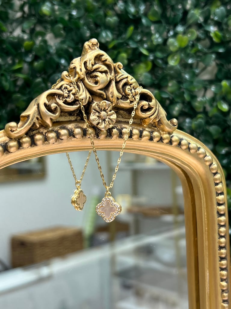 double sided clover pendant, shell design w cz. 18" chain, gold-filled.
