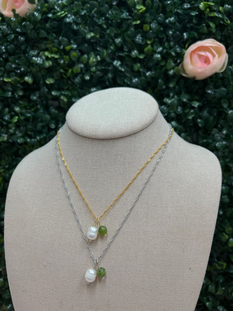 natural freshwater pearls, grade a nephrite jade bead. chains are 18" singapore, 24k gold-filled & white gold-filled.